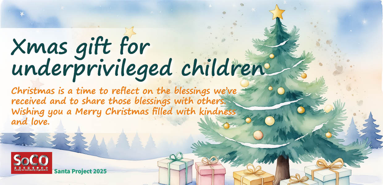 There are about 215,000 poor children in Hong Kong, and 50,000 of them are living in sub-divided cubicles in poor conditions. Therefore, since 2004, the Society for Community Organization has recruited community members as Santa Claus through the Santa Project to deliver Christmas gifts to needy grassroots children. The Christmas wishes of nearly 3,000 poor children this year were mostly for the necessities of life/learning, such as black shoes/white sneakers for school, school bags, books, quilts, sports equipment, etc.