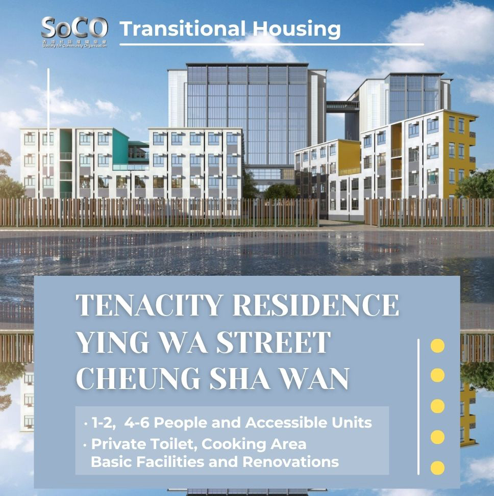 The Society for Community Organization(SoCO) will commence the project of “TENACITY RESIDENCE: Cheung Sha Wan Modular Social Housing,” under SoCO’s scheme of “Prior Housing Social Housing” in the first quarter of 2022. “TENACITY RESIDENCE” has been endorsed to relieve the housing pressure of grassroots 1 to 7 person families (not including 3 person families) and improve their quality of life. Additionally, specially designed co-spaces, e.g., Community Garden, Amusement/Gym Facilities, aim at arousing the awareness of green and healthy social lifestyle among tenants and the public.