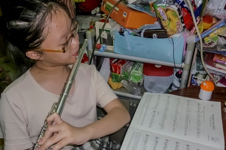 Pie-ki keeps the flute with her all the time. She takes a 30-minute lesson each week. The monthly tuition fee is $760. The fee will be higher if a lesson is extended by 15 minutes. She would rather work harder by practicing her breathing and remembering the rhythm every day. "This is my dream. Why should I be afraid of hard work?" The examination fee amounts to two or three times the tuition fees. Sometimes, Pie-ki worries about money, however, on the whole she lives quite happily. She says that even if a poor person earns only $5 a month, they can use the $5 wisely and live productively. On the other hand, a wealthy man earning $50 may not appreciate it and will spend it easily.