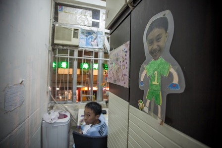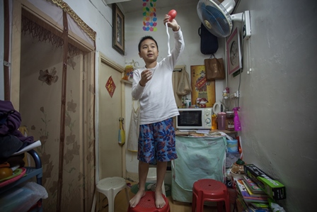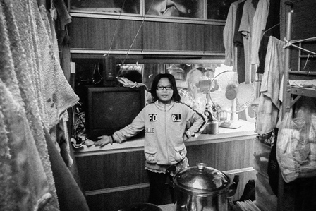 Natalie's family of four live in a small sub-divided unit in a Sham Shui Po flat. Walking into the unit, the bunk bed is on the left-hand side and she sleeps on the upper deck. Her parents and younger brother sleep on the lower bunk, side-by-side and perpendicular to the long edge of the bed. Since the bed is not wide enough, a wooden stool is placed beside it for feet to rest on. On the right-hand side of the unit is a small table and wardrobe. At the end of the bed is a television and a broken computer. Personal items fill up the remaining space. The only free area is the few floor tiles in the middle measuring less than six feet long and just one foot wide. They all squeeze into the bed to take a family photograph.